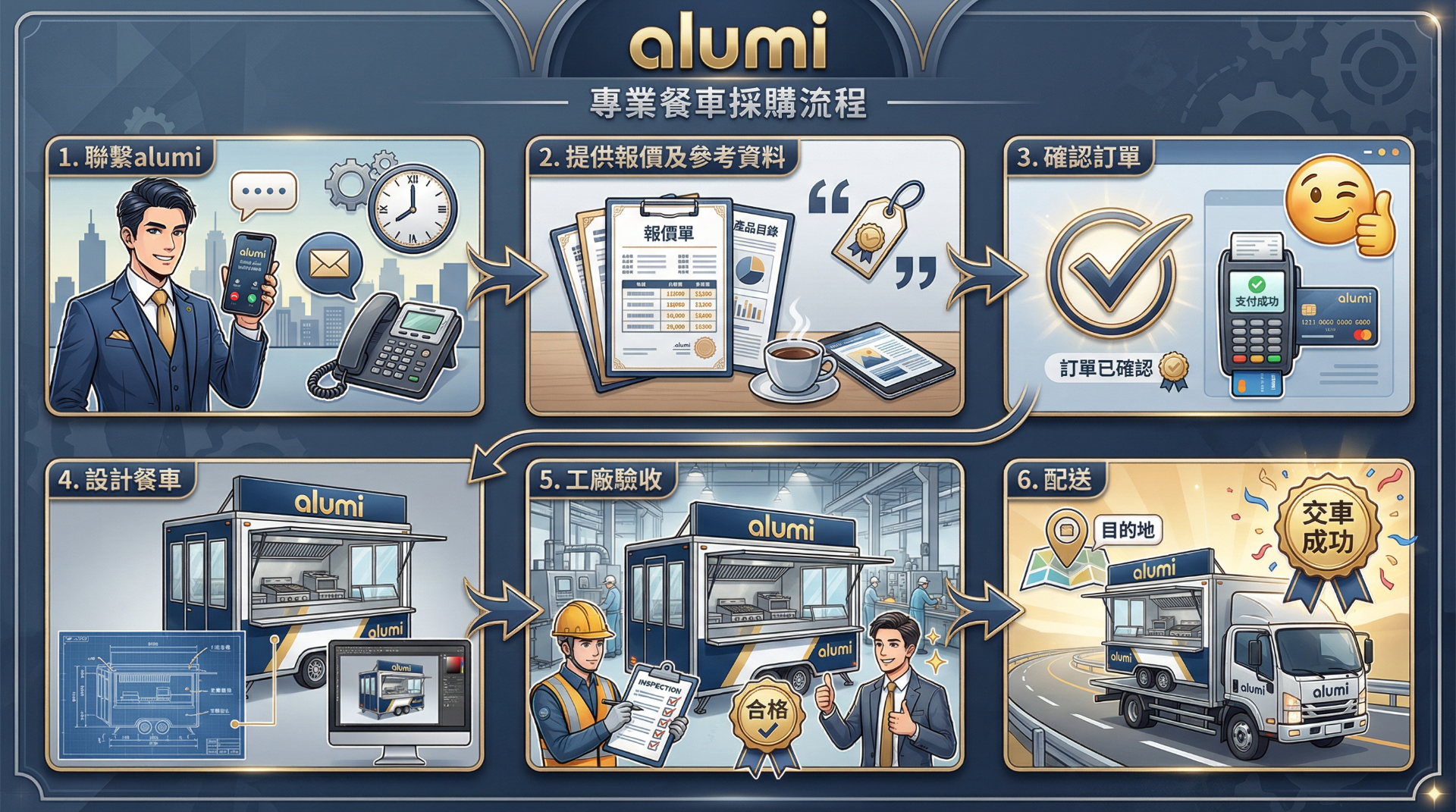 在您於工廠驗收車輛無誤後,alumi 收到剩餘尾款後,alumi將安排您的餐車交運到指定的縣市。